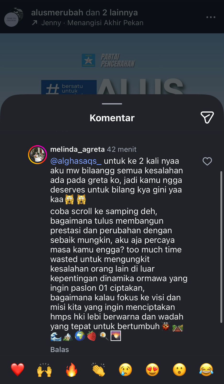 Meskipun tangkapan layar tersebut sempat memicu kehebohan, AG sempat memberikan klarifikasi melalui kolom komentar di media sosial, namun kini dihapus. AG membenarkan adanya percakapan bernuansa seksual tersebut. Ironisnya, saat ini AG dan TM dilaporkan masih berada dalam satu koalisis pememnangan (Timses) kampanye untuk Pemiluwa HMPS HKI.