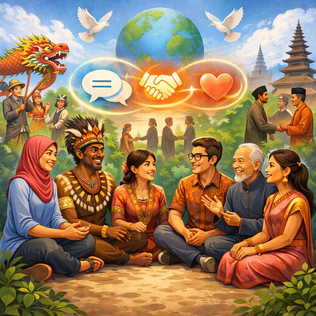 Indonesia merupakan negara yang kaya akan keberagaman budaya, suku, agama, dan bahasa. Keberagaman tersebut menjadikan Indonesia sebagai masyarakat multikultural yang memiliki potensi besar sekaligus tantangan dalam menjaga keharmonisan sosial. Dalam kondisi ini, dialog antarbudaya menjadi salah satu strategi penting untuk menjembatani perbedaan dan menciptakan kehidupan masyarakat yang damai serta saling menghargai.