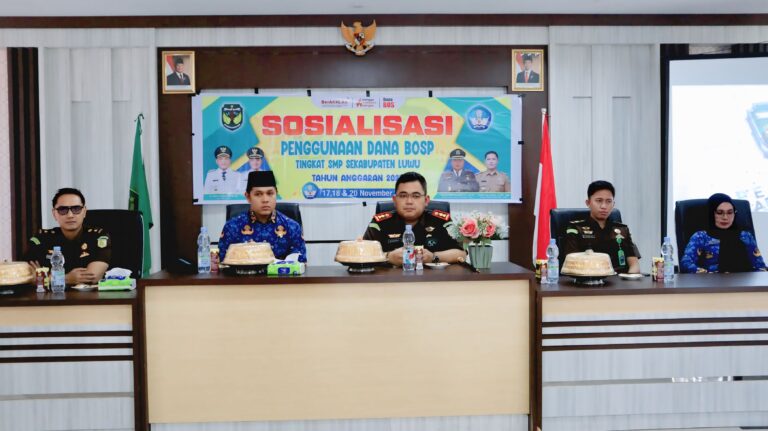 BELOPA – Dinas Pendidikan Kabupaten Luwu bekerja sama dengan Kejaksaan Negeri Luwu menggelar Sosialisasi Penggunaan Dana BOSP Tahun 2025 yang diikuti para Kepala Sekolah dan Bendahara SMP se-Kabupaten Luwu. Kegiatan berlangsung di Aula Kantor Kementerian Agama Kabupaten Luwu dengan fokus utama memberikan pemahaman terkait pencegahan korupsi dalam proses pengelolaan serta pengadaan barang dan jasa menggunakan Dana BOSP.