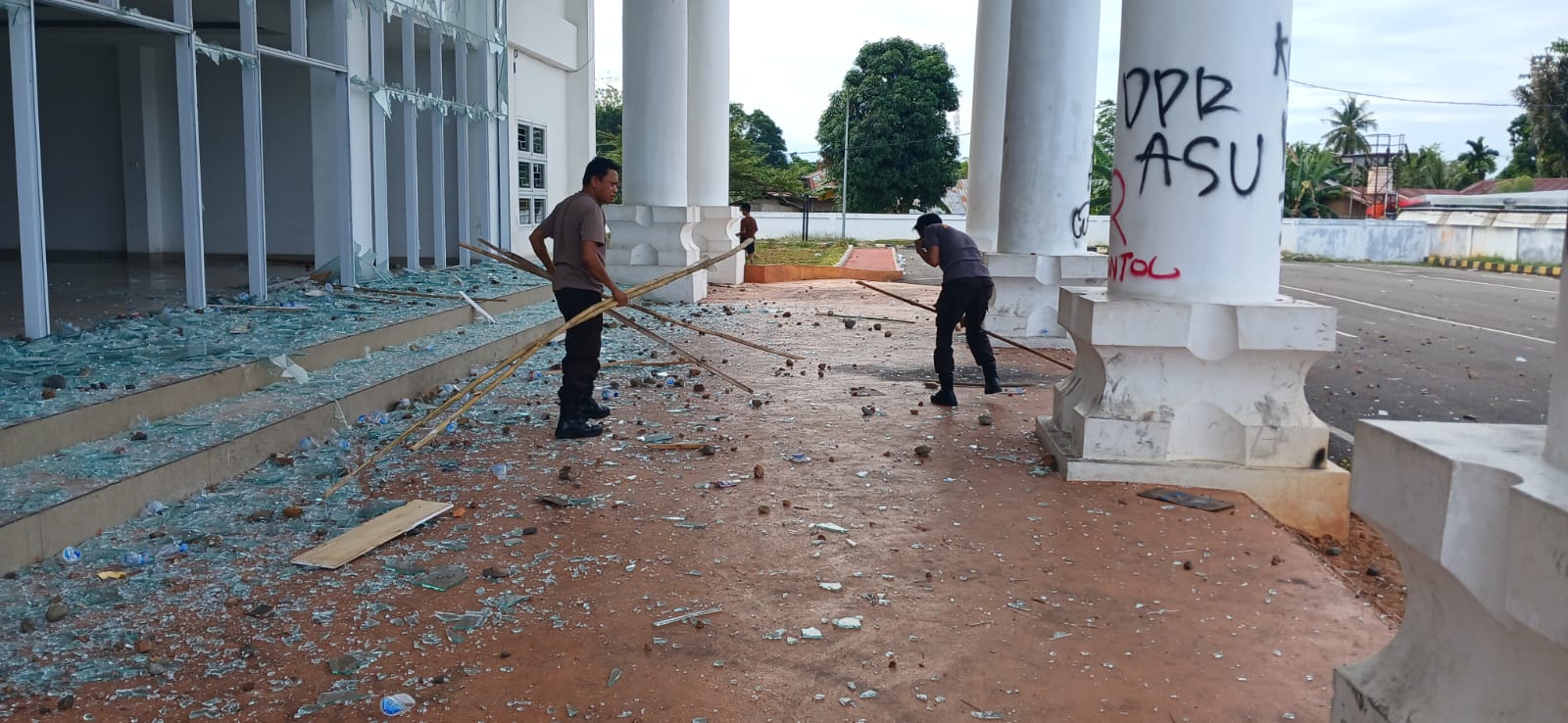 Kondisi kantor sempat dipenuhi serpihan kaca, sisa ban terbakar, batu, hingga sampah yang berserakan baik di halaman maupun di dalam ruangan.