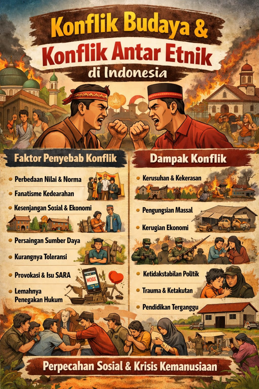 Konflik budaya dan konflik antar etnik di Indonesia merupakan fenomena sosial yang tidak terlepas dari kondisi masyarakat Indonesia yang sangat majemuk. Keberagaman suku, agama, ras, bahasa, serta adat istiadat menjadi kekayaan bangsa, tetapi di sisi lain juga berpotensi menimbulkan konflik apabila tidak dikelola dengan baik. Konflik budaya terjadi ketika terdapat perbedaan nilai, norma, dan kebiasaan yang tidak dapat diterima atau dipahami oleh kelompok lain, sedangkan konflik antar etnik lebih mengarah pada pertentangan antara kelompok suku tertentu yang dipicu oleh berbagai faktor sosial, ekonomi, maupun politik. Dalam konteks Indonesia, konflik semacam ini pernah terjadi di berbagai daerah dan meninggalkan dampak yang cukup besar bagi kehidupan masyarakat.