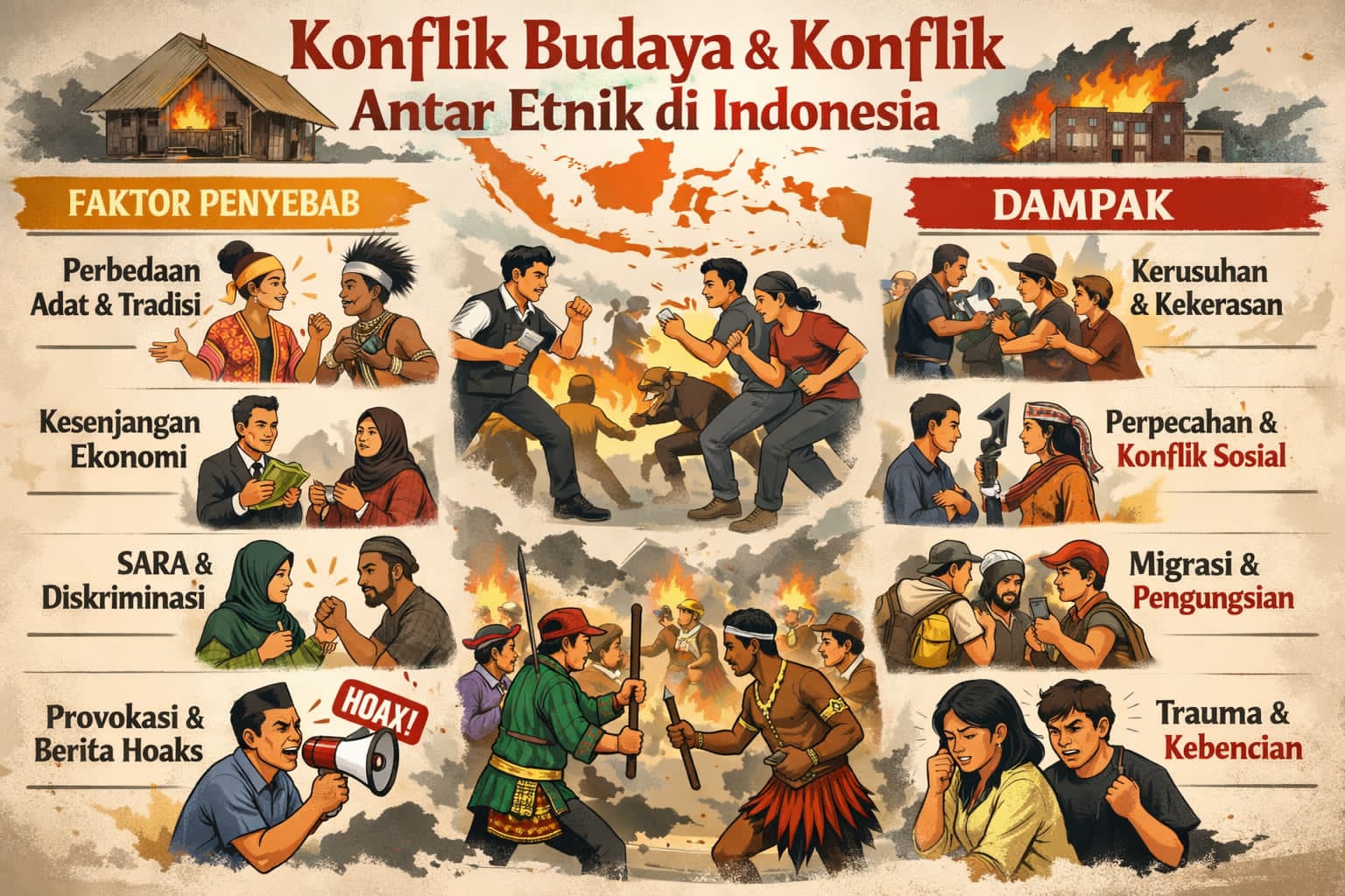 Dampak konflik budaya dan konflik antar etnik sangat luas dalam kehidupan sosial masyarakat. Konflik etnik dapat menyebabkan kerusakan hubungan sosial, persaingan tidak sehat, serta melemahnya kohesi sosial dalam masyarakat (Tumanggor & Azhar, 2025). Kondisi ini berdampak pada menurunnya kepercayaan antar kelompok serta meningkatnya potensi konflik lanjutan.