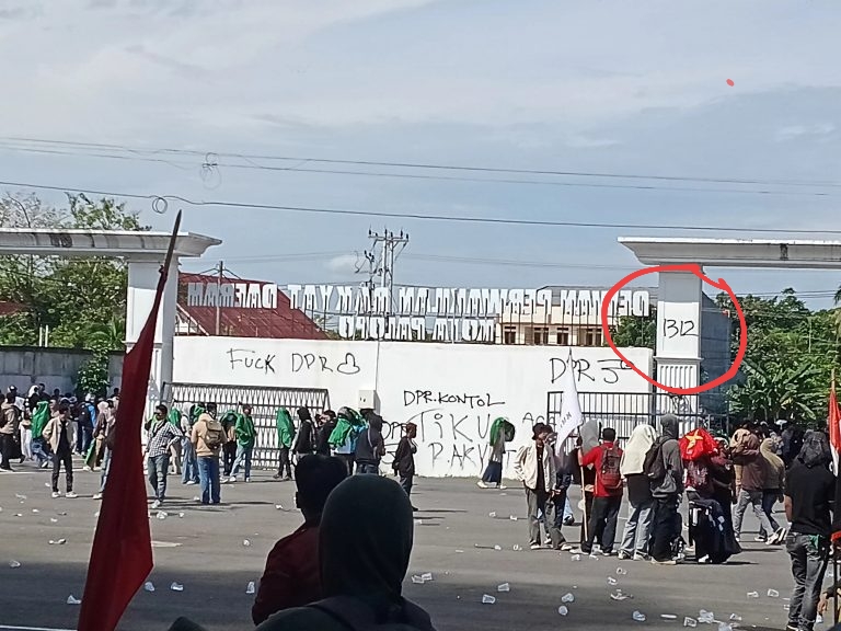 Palopo – Aksi demonstrasi yang digelar oleh Aliansi BARISAN DARI RAKYAT di Tobulung, Kecamatan Bara, Kota Palopo, Sulawesi Selatan, pada Senin (1/9/2025) diwarnai dengan munculnya tulisan “1312” di dinding pagar DPRD Kota Palopo.