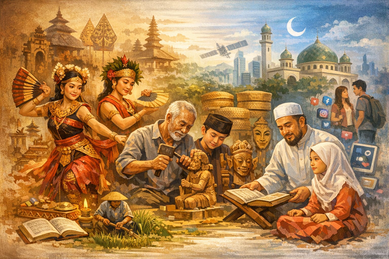 Gambar yang saya tampilkan di atas menggambarkan orang-orang yang sedang melakukan aktivitas budaya seperti menari tradisional, mengukir, dan belajar agama, contoh nyata bagaimana budaya dijalankan dalam kehidupan sehari-hari.