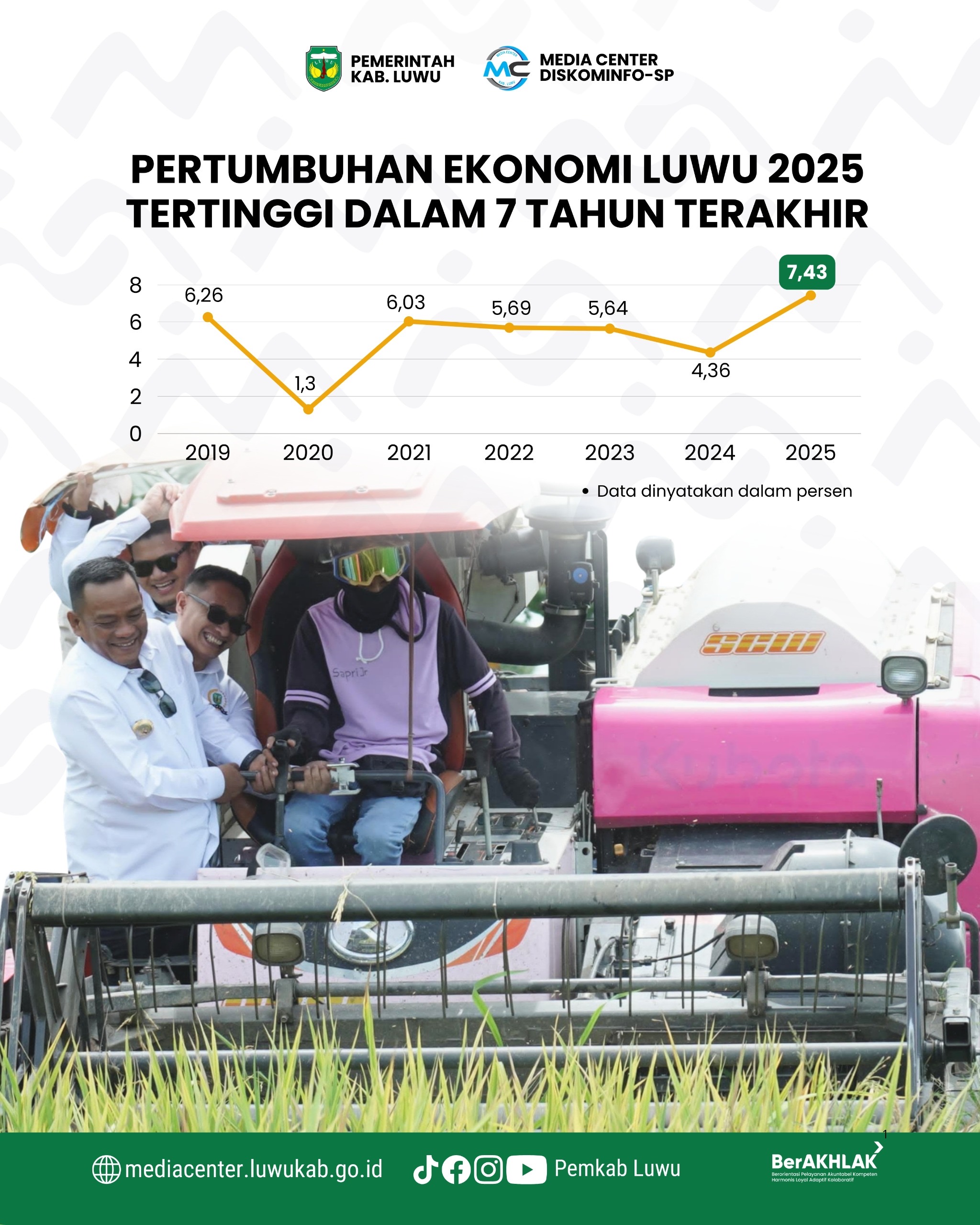 LUWU – Pertumbuhan ekonomi Kabupaten Luwu pada tahun 2025 tercatat mencapai 7,43 persen berdasarkan data resmi Badan Pusat Statistik Kabupaten Luwu. Capaian ini menjadi yang tertinggi dalam tujuh tahun terakhir sekaligus menandai momentum pemulihan ekonomi daerah.