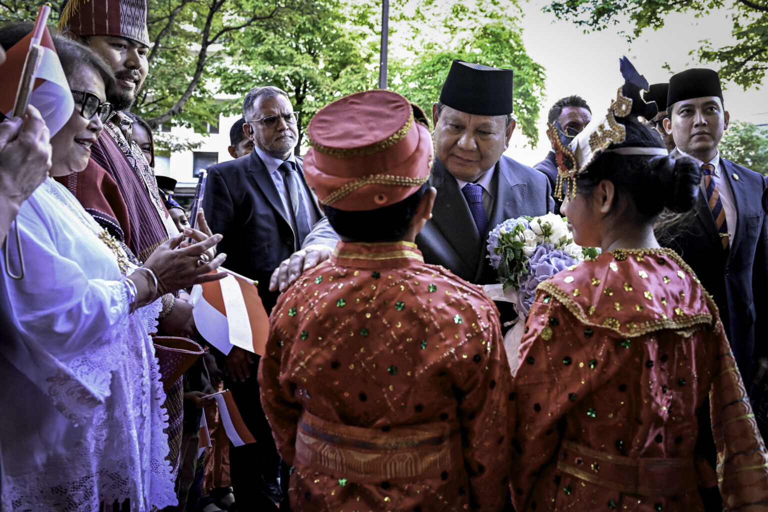 Presiden Prabowo tampak tersenyum ramah, melambaikan tangan, dan menyapa masyarakat sambil mengibarkan bendera kecil Merah Putih. Sambutan tersebut mencerminkan semangat nasionalisme yang tetap hidup di kalangan warga Indonesia di luar negeri.